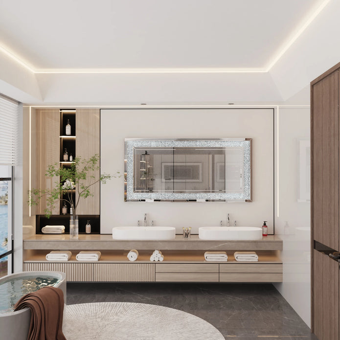 Crafted from high-quality silver-coated glass, it offers exceptional clarity and long-lasting durability. The frameless modern design with refined crystal detailing brings a touch of contemporary Chinese-inspired elegance, making it an ideal centerpiece for bedrooms, dressing areas, or living rooms.