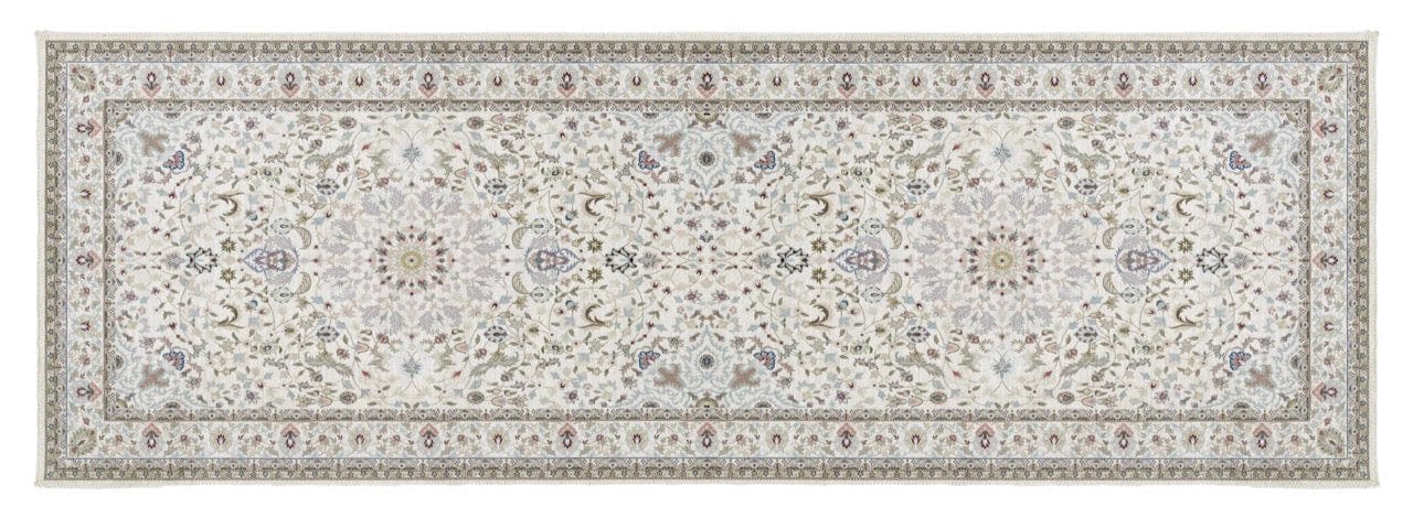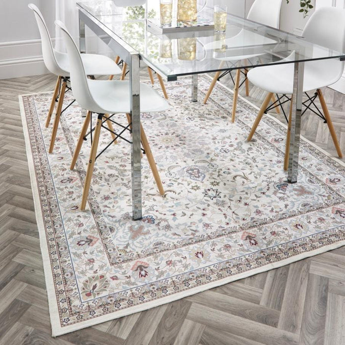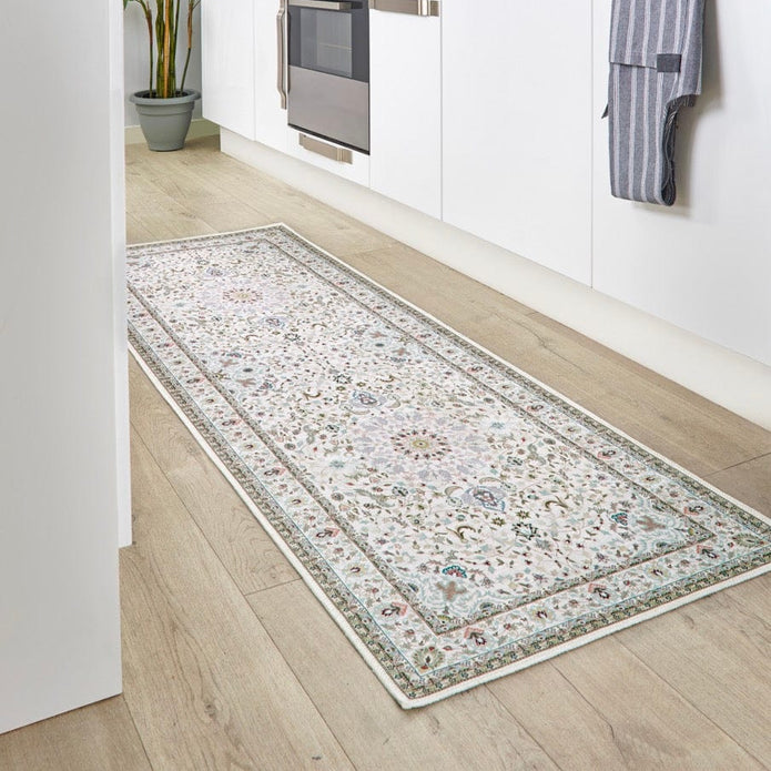 Our new range of My Washable easy-care rugs are an excellent solution for busy households where spills are bound to occur. The traditional and elegant design of our Windsor rug contains a print inspired by flora and fauna with an ornate boarder to add a traditional feel. In a beautiful soft colour palette containing mainly natural tones with hints of blue’s, maroons and green to add some subtle colour to your home. Made from soft, yet hard wearing Chenille and TRP with a non-slip backing, meaning you can easily lay the rug down before and after washing. Ideal for high traffic areas such as your kitchen, hallway, dining room and living rooms. MACHINE WASH AT 30, DO NOT USE BLEACH. LINE DRYING IS RECOMMENDED. IF USING A DRYER, DO NOT USE HEAT. USE AN AIR-ONLY DRY CYCLE.